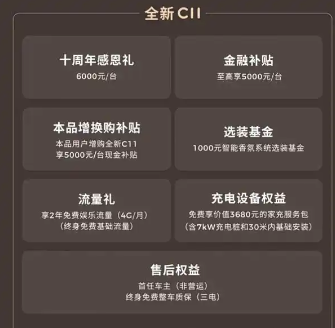 临近年底,零跑12月份购车能够享受6000元的十周年感恩礼现金补贴,进一步降低了购车门槛,本品用户增换购有5000元现金补贴,还有至高5000元金融贴息,实实在在的在帮用户减轻压力;还有其他包含三电的整车终身质保等权益都挺吸引人。