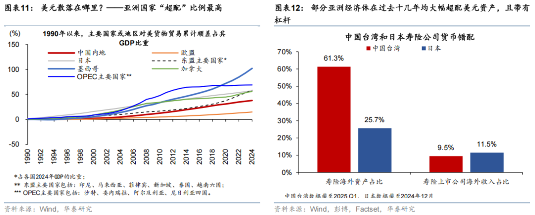 亚洲经济体“超配”美元资产的幅度较大,全球去美元化将带动亚洲资金回流、并带动人民币进一步升值。美元作为全球储备货币,在全球化加速时代享有较高的估值溢价和超额配置。90年代后,中国、日本、东盟等亚洲经济体对美累积大规模货物贸易顺差(占美国累计逆差的5-6成左右),“超配”美元的幅度较大——日本银行、中国台湾地区寿险公司配置外币资产的比例明显偏高即是例证(图表11和12)。如果美元趋势性贬值,亚洲经济体纠正本外币错配、减少美元的“超配”势在必行,其潜在的资金回流体量不可低估。而在中国,金融机构之外,出口商也在2012年后大幅超额“配置”美元资产,部分体现为出口商的结汇比例大幅下降。如果按照2001-21年的平均结汇比例来估算,2022年以来可能有超过8,000亿美元出口收入未结汇,显示跨境资本存在进一步流入的空间。