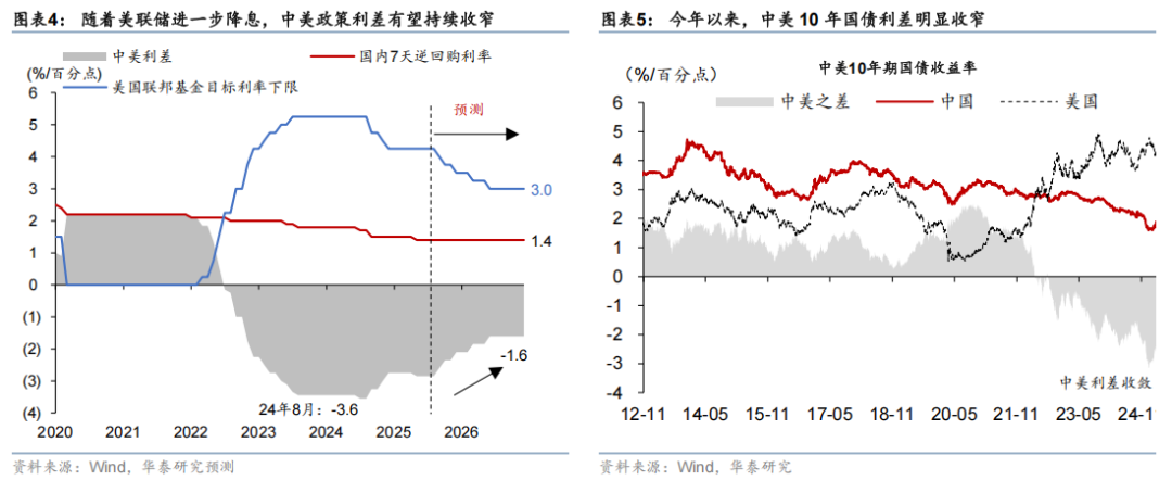 美中利差缩小——美债曲线下移,而中国曲线陡峭化。今年以来,中美之间短端和长端利差均明显收窄。年初至今,中美政策利率利差收窄至15个基点至2.6%,且大概率进一步降至2%以内——即如果人民币出现升值趋势,利差已经不再对持有美元现金的相对收益形成有效保护。今年以来,人民银行仅下调政策利率10个基点,而目前市场预期短期中国基准利率不再下调,而美联储今年已经累计降息25个基点,且年内有望进一步降息50个基点(含10月29日议息会议)、明年或进一步降息(图表4)。两国长债利率也有所收敛——美国增长预期下调、劳工数据走弱、联储加速降息等因素推动美国10年期美债收益率从年初的4.6%左右回落至4.0%附近。而受中国增长预期上调以及股市走强等因素影响,中国10年期国债收益率从年初的1.6%附近回升至1.8%以上。由此,中美10年期国债利差从年初的-3个百分点明显收窄至-2.1个百分点左右(图表5)。