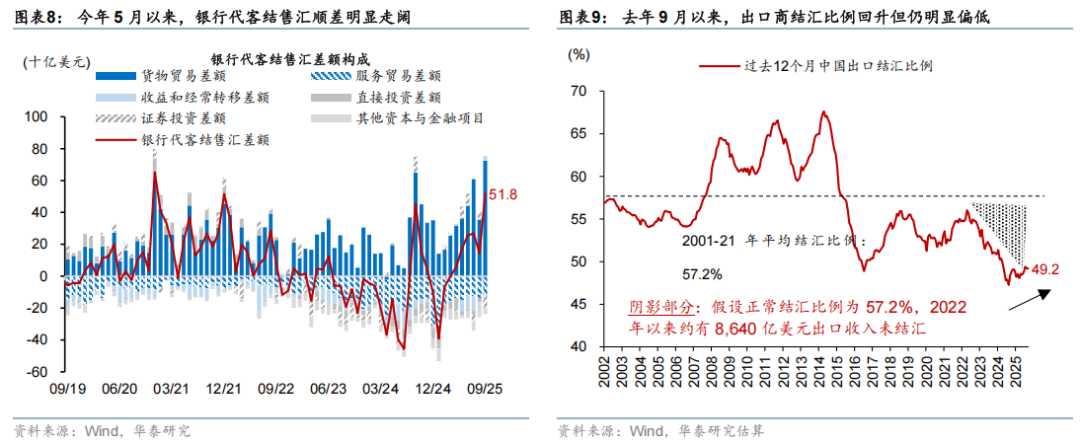 随着贬值预期消弥,升值预期蓄势,人民币结汇需求上升,此前流出的压力逆转,流入创2021年3月来新高。随着5月中旬中美关税降级,人民币贬值预期明显消退,银行代客结售汇顺差明显走阔,单月顺差已经达到2021年3月来最高水平,显示人民币升值预期持续升温(图表8)。而早在去年9月,随着稳增长政策发力,出口商结汇比例已开始稳步上升(图表9)。今年以来,随着国内资本市场表现稳健,证券投资项下开始录得净流入,进一步和人民币升级预期“蓄势”形成正循环。