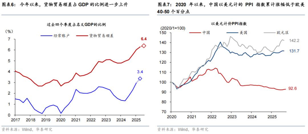 中国出口持续超预期、9月再加速,顺差强势增长,彰显人民币汇率的强大竞争力。虽然美国对中国大幅加征关税,但今年前9个月中国出口累计同比增长6.1%,在去年全年增长5.8%的基础上上进一步加速,带动贸易顺差累计同比增长26%、占GDP的比例继续上升(图表6)。一方面,出口持续超预期,显示中国制造业在供应链产业链齐全、原材料和能源价格低、电信物流等各项服务高效、以及人力成本性价比等全方位的成本和效率优势,如2020年以来,中国以美元计的PPI指数累计涨幅低于欧美40-50个百分点;同时,今年人民币兑一篮子汇率走弱进一步加持了中国出口竞争力。